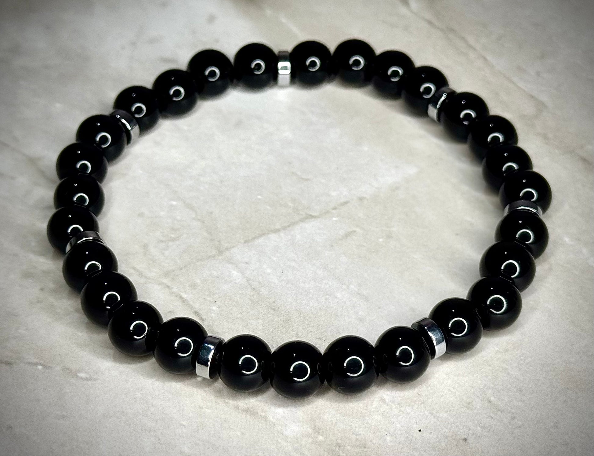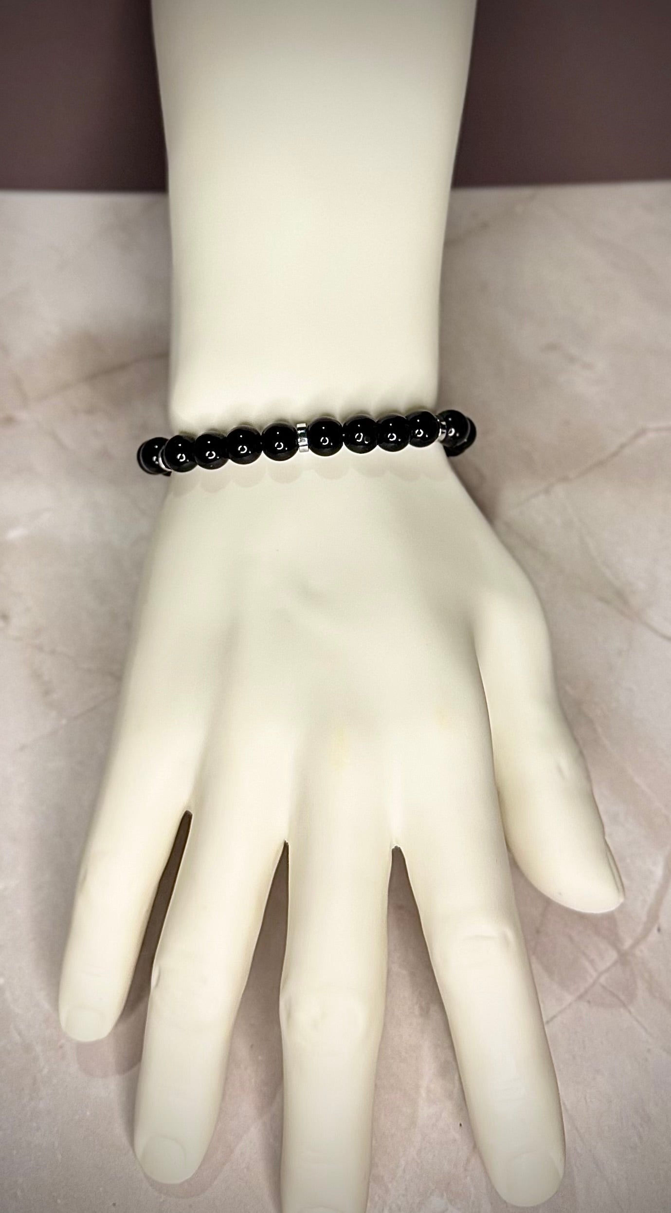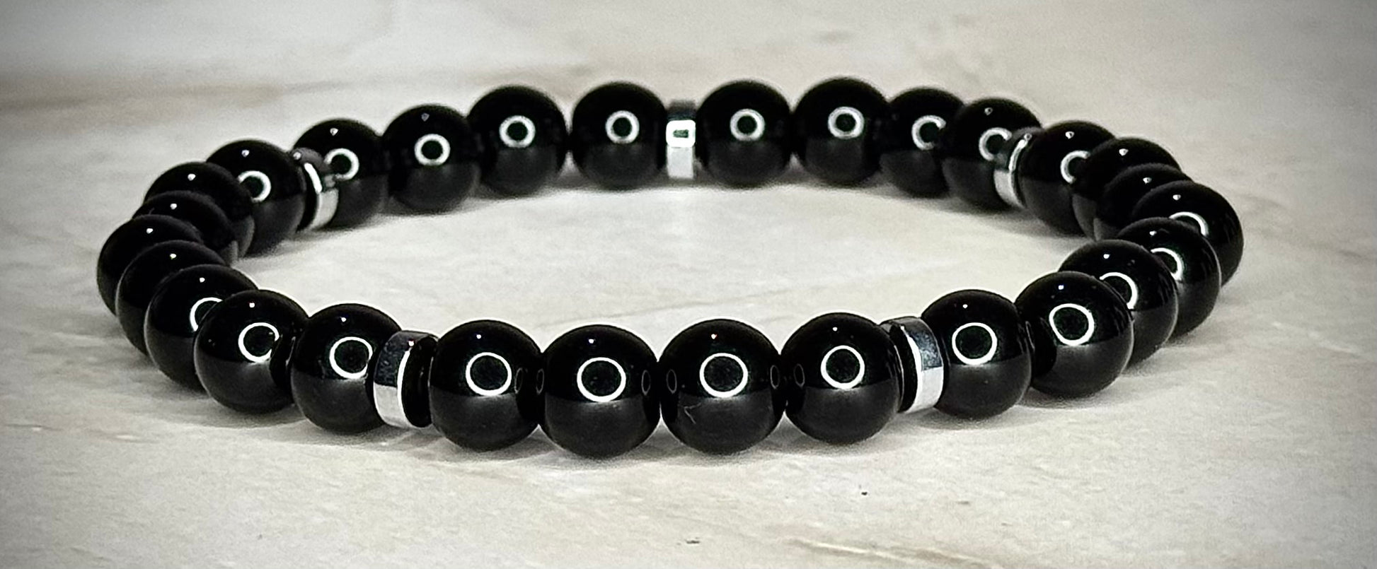 Embrace bold elegance with the Dark Abyss Bracelet, featuring sleek black glass beads accented by polished silver spacers. Mysterious and refined, it’s the perfect statement piece for those who thrive in strength, style, and sophistication.